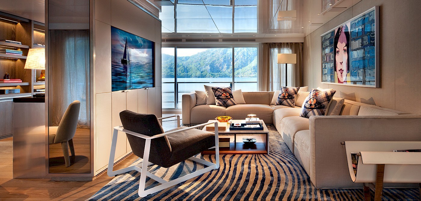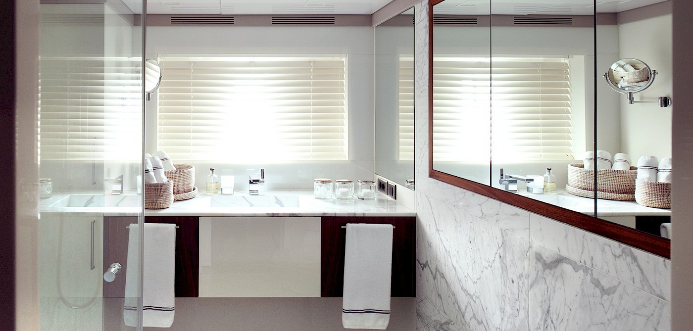 ORIENT STAR superyacht offers chic accommodation for 10 guests. There are five cabins on board: a master stateroom with a study area on the main deck with a walk-in wardrobe and a spacious ensuite, 2 twin suites that are not convertible, and two double cabins on the lower deck.